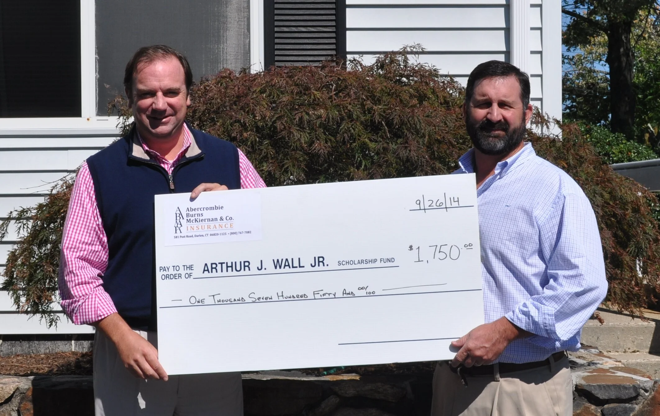 Kevin McKiernan of Abercrombie, Burns & McKiernan Insurance Company in Darien, CT recently presented a check for $1,750 to Kevin Wall for The Arthur J. Wall Jr. Memorial Scholarship Fund. “Abercrombie, Burns & McKiernan is proud to support The Art Wall Scholarship Fund and their efforts to not only recognize outstanding student athletes and their dedication to community service but also for their dedication towards assisting other 501 (c)(3) organizations that help Wilton families” said Mr. McKiernan. “On September 30th we provided a $5,000 check to Wilton Youth Council as part of our Community Outreach Program and I want to thank Abercrombie, Burns & McKiernan for their outstanding support over the years. We have awarded over $100,000 in scholarships and $15,000 via our outreach program thanks to the support of businesses like Mr. McKiernan’s” said Mr. Wall.
